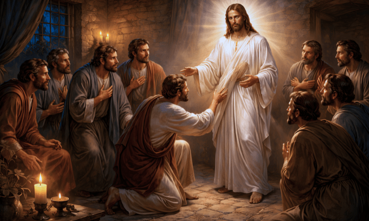 Setelah Yesus wafat di salib, pada malam pertama sesudah hari Sabat, berkumpullah murid-murid Yesus di suatu tempat dengan pintu-pintu yang terkunci karena mereka takut kepada orang-orang Yahudi. Pada waktu itu datanglah Yesus, berdiri di tengah-tengah mereka dan berkata, “Damai sejahtera bagi kamu.” Sesudah berkata demikian, Yesus menunjukkan tangan dan lambung-Nya kepada mereka. Murid-murid itu bersukacita ketika mereka melihat Tuhan. Maka kata Yesus sekali lagi, “Damai sejahtera bagi kamu! Sama seperti Bapa mengutus Aku, demikian juga sekarang Aku mengutus kamu.” Dan sesudah berkata demikian, Yesus mengembusi mereka dan berkata, “Terimalah Roh Kudus. Jikalau kamu mengampuni dosa orang, dosanya diampuni, dan jikalau kamu menyatakan dosa orang tetap ada, dosanya tetap ada.”