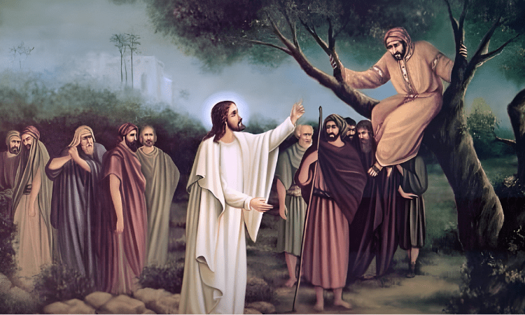Yesus masuk dan melintasi Kota Yerikho. Di situ ada seseorang bernama Zakheus, kepala pemungut cukai, dan ia orang yang kaya. Ia berusaha untuk melihat siapakah Yesus itu, tetapi ia tidak berhasil oleh karena orang banyak, sebab badannya pendek. Ia pun berlari mendahului orang banyak, lalu memanjat pohon ara untuk melihat Yesus yang akan lewat di situ. Ketika Yesus sampai ke tempat itu, Ia melihat ke atas dan berkata kepadanya, ”Zakheus, segeralah turun, sebab hari ini Aku harus menumpang di rumahmu.” Zakheus pun segera turun dan menerima Yesus dengan sukacita. Melihat hal itu, semua orang mulai bersungut-sungut, katanya, ”Ia menumpang di rumah orang berdosa.” Namun, Zakheus berdiri dan berkata kepada Tuhan, ”Tuhan, lihatlah, setengah dari milikku akan kuberikan kepada orang miskin dan sekiranya ada sesuatu yang kuperas dari seseorang akan kukembalikan empat kali lipat.” Kata Yesus kepadanya, ”Hari ini telah terjadi keselamatan kepada rumah ini, karena orang ini pun anak Abraham. Sebab, Anak Manusia datang untuk mencari dan menyelamatkan yang hilang.”