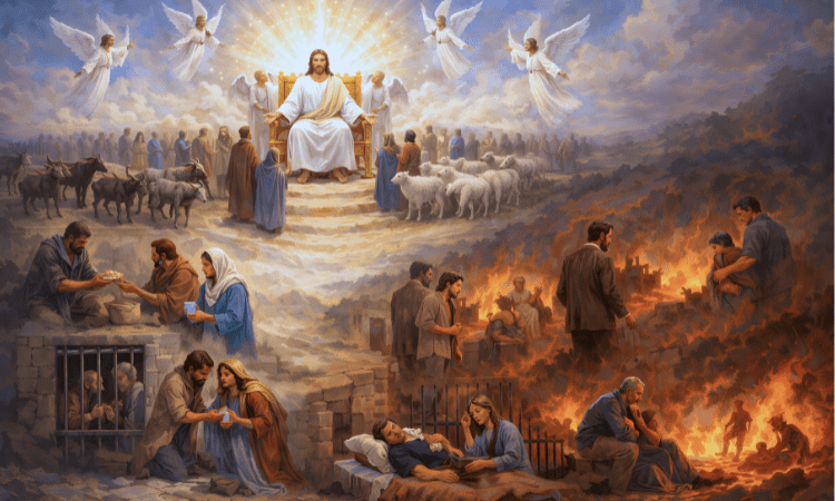 Yesus berkata kepada murid-murid-Nya, “Apabila Anak Manusia datang dalam kemuliaan dan semua malaikat datang bersama-sama dengan Dia, maka Ia akan bersemayam di atas takhta kemuliaan-Nya. Lalu semua bangsa akan dikumpulkan di hadapan-Nya dan Ia akan memisahkan mereka seorang daripada seorang, sama seperti gembala memisahkan domba dari kambing; Ia akan menempatkan domba-domba di sebelah kanan-Nya dan kambing-kambing di sebelah kiri-Nya.